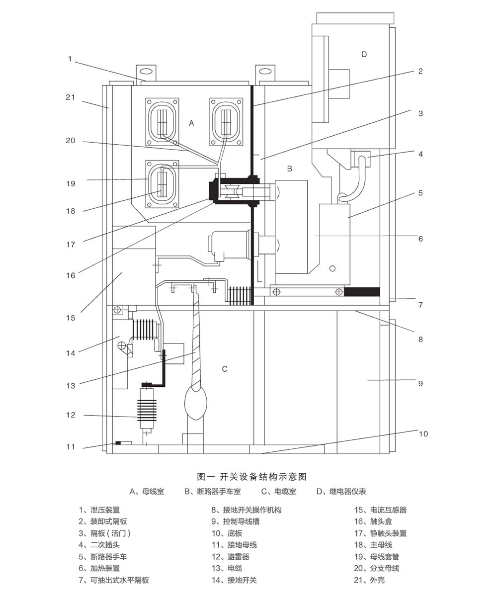 開關(guān)設(shè)備采用中置式,因而電纜室空間較大。電流互感器 15、接地開關(guān) 14 裝在隔室后壁上,避雷器 12 安裝于隔室后下部。打開柜下門后,施工人員就能從下面進(jìn)入柜內(nèi)安裝和維護(hù)。電纜室內(nèi)的電纜連接導(dǎo)體,每相可并 1-3 根單芯電纜。必要時每相可并接 6 根單芯電纜,聯(lián)接電纜的柜底配制開縫的可卸式非金屬封板或不導(dǎo)磁金屬封板,確保了施工方便。