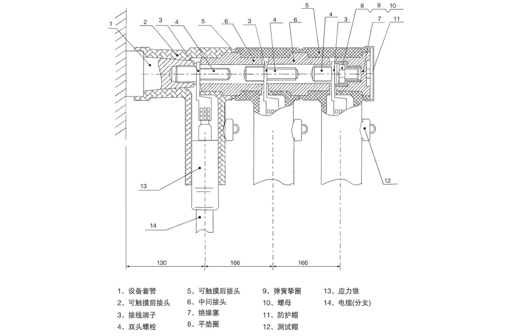 采用進(jìn)口優(yōu)質(zhì)絕緣橡膠全自動注射而成,內(nèi)外層均為半導(dǎo)體屏蔽層,內(nèi)層用來均衡內(nèi)部電場,外屏蔽層接地保護(hù)電纜頭表面零電位。應(yīng)力錐下端內(nèi)層與電纜的半導(dǎo)體層緊密接觸,而外半導(dǎo)體層又與電纜頭外半導(dǎo)體層緊密接觸,并通過電纜頭的接地孔接地,這樣不僅解決了電纜外屏蔽層切斷處的電場集中問題,而且使電纜外屏蔽層保持零電位,保證人身安全。可觸摸電纜前接頭直接安裝在設(shè)備套管上,其后可與可觸摸電纜后接頭連接,組成多路出線,也可與避雷器連接,為電網(wǎng)提供過電壓保護(hù)。