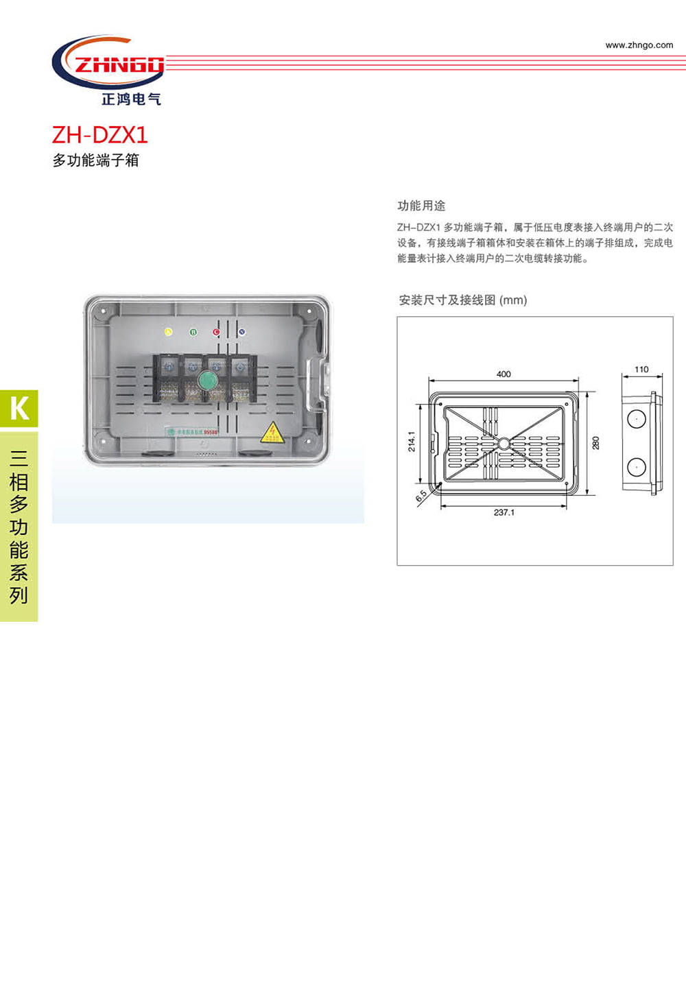 ZH-DZX1 多功能端子箱,屬于低壓電度表接入終端用戶的二次設(shè)備,有接線端子箱箱體和安裝在箱體上的端子排組成,完成電能量表計接入終端用戶的二次電纜轉(zhuǎn)接功能。